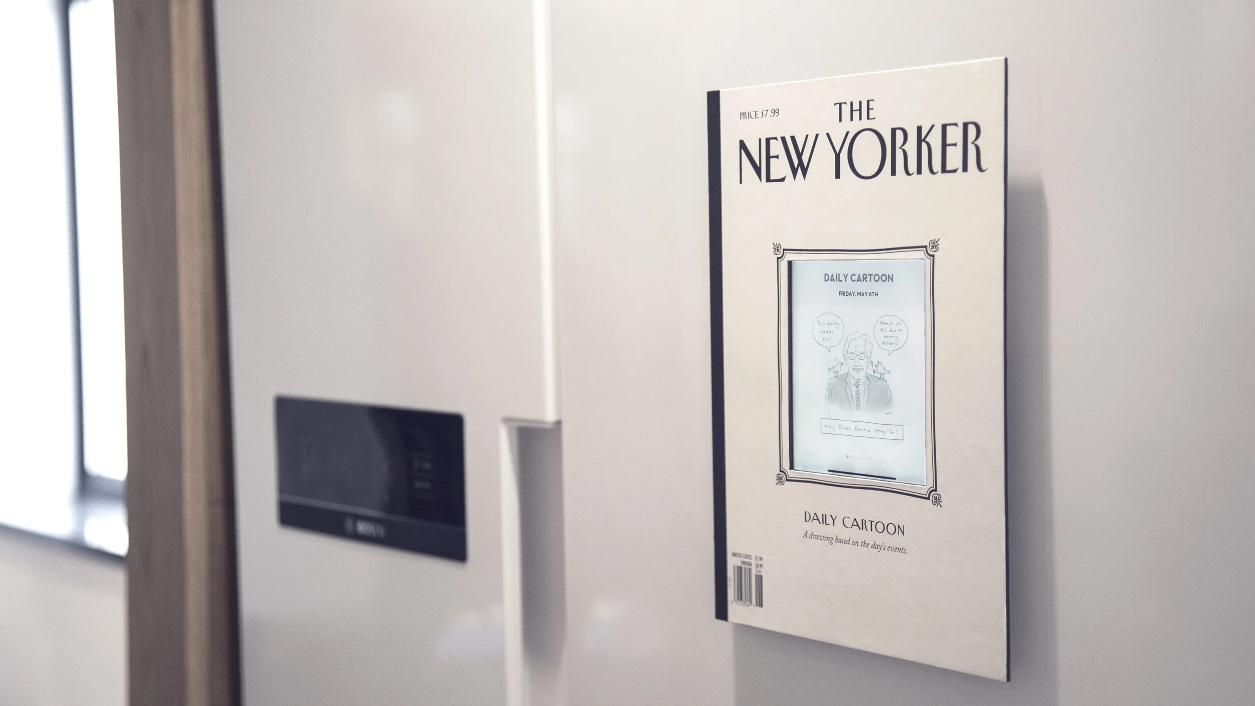 I set up a simple Kindle-friendly website fetching the "Daily Cartoon" of The New Yorker through their dedicated RSS feed and turned my old Kindle into the funniest fridge magnet.